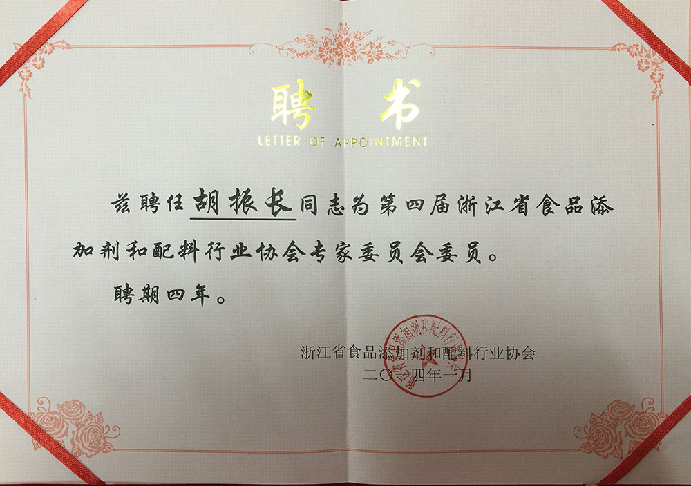 Member of Zhejiang Province Food Additive & Ingredients Industry Expert Committee