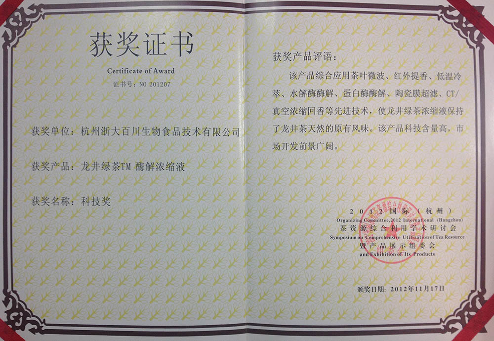 Technology Award of Longjing Green Tea Enzymolysis Concentrate