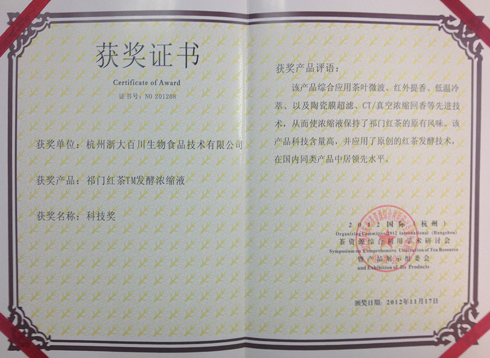 Technology Award of Keemum Black Tea Fermented Concentrate